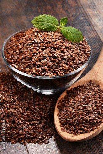 Composition with bowl of flax seeds on wooden table
