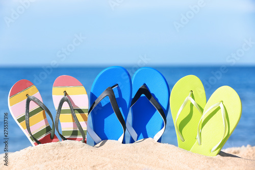 Composition with bright flip flops on sand near sea in summer. Beach accessories