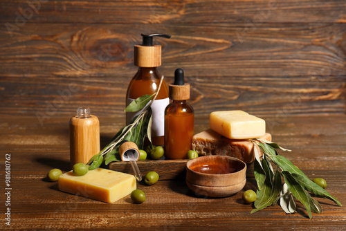 Composition with natural cosmetic products, green olives and oil on wooden background