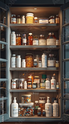 Comprehensive Medical Cabinet. Well organized medical cabinet filled with various bottles and containers of medication.