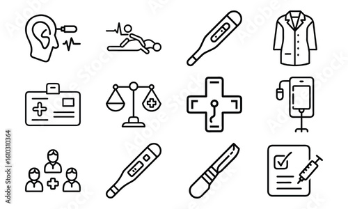 Comprehensive Medical Line Icons Set – Hearing Test, CPR, Thermometer, Doctor Coat, IV Drip, Medical Ethics, ID Badge, Surgical Tools, Certificate, and Healthcare Team Symbols for Apps,