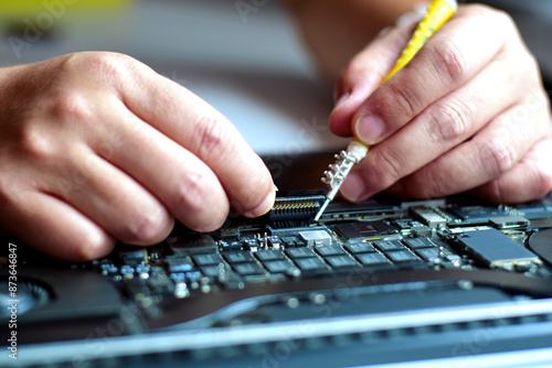 computer technician laptop motherboard repair technician The technician uses a screwdriver to separate the ribbon cable from The motherboard came repaired on the table.