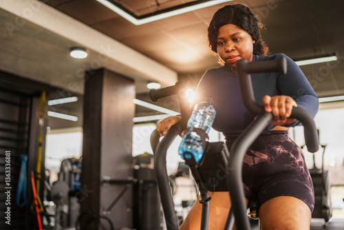 overweight, woman, gym, exercise bike, fitness, physical exercise, training, health, lifestyle, sport, wellness, active, healthy, female, athlete, black, african american, person, exercising, cycling, cardio, equipment, machine, indoor, determination, effort, motivation, strength, power, endurance, weight loss, activewear, well-being, recreation, leisure, activity, modern, club, center, concentrated, sharpened, dedicated, improvement, progress