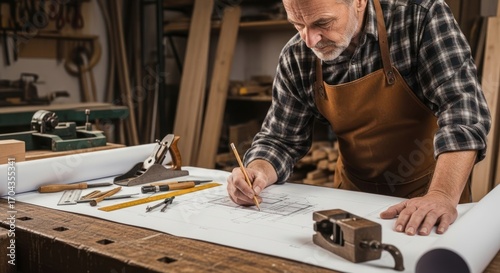 carpenter, carpenter's shop, craftsman, artisan, blueprint, design, construction, planning, professional, expertise, workshop, tool, wood, workbench, apron, crayons, ruler, instrument, detail, precision, skilled, experienced, elderly, senior, mature, man, male, adult, person, architecture, interior, building, furniture, craft, equipment, industry, hand-made, occupation, drawing, technical, cognition