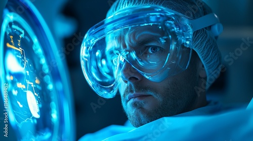 surgeon, doctor, health care, medicals, technology, science, hospital, surgery, health, medicine, digital, datum, screen, analysis, research, exam, patient, treatment, care, diagnostic, innovation, future, progress, professional, sharpened, concentration, expertise, precision, detail, light, blue, goggles, goggles, cap, face, man, person, intense, serious, work, laboratory, clinic, equipment, monitor, display, information