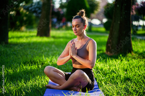 Concentrated young woman with crossed legs, praying hands and closed eyes in lotus position meditating on yoga mat in park at sunset, breathing exercise