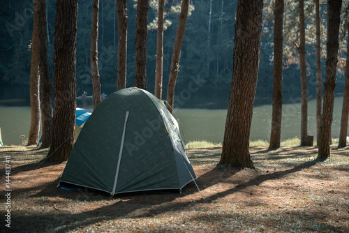 Concept camping blur background mountain cloud sky enhances nature outdoor tourism comes close up orange blue tent peaceful pine forest scenic woodland vacation Sunlight tree fog cold winter morning