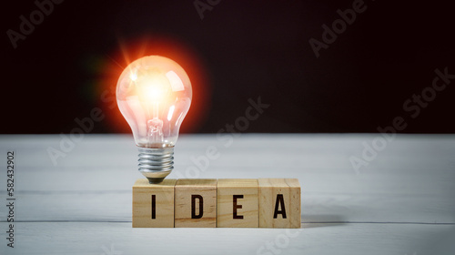 Concept idea, brainstorming, motivation, creativity, innovation, imagination, business solution and design, inspiration for creative invention. Idea word on wood block and light blub, no people.