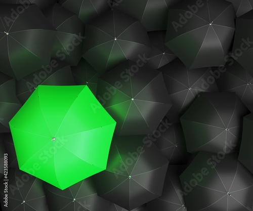 Concept image with lots of black umbrellas and a red umbrella that stands out, be unique