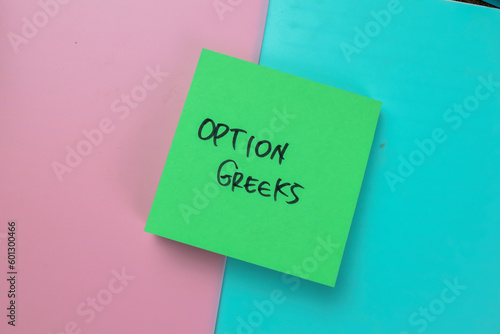 Concept of Option Greeks write on sticky notes isolated on Wooden Table.