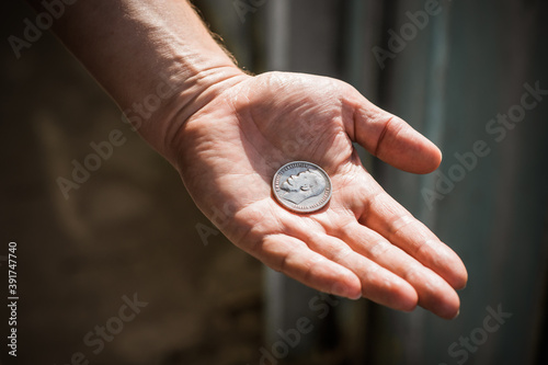 Concept of poverty, and destitution, money and coins. Poor people, need a help