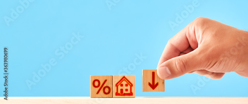 concept of reducing interest rates on mortgages. wooden blocks with house, percent and down arrow icon