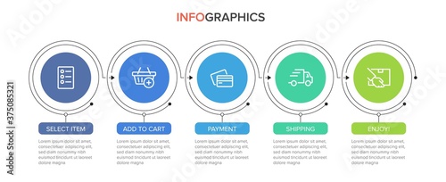 Concept of shopping process with 5 successive steps. Five colorful graphic elements. Timeline design for brochure, presentation, web site. Infographic design layout.