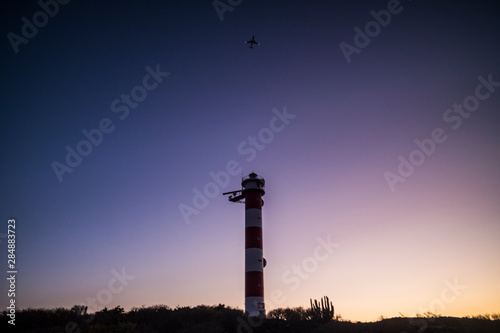 Concept of travel with classic lighthouse and airplane fight over him - dusk aftersunset. scenic moment with coloured sky