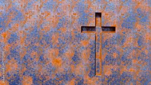 Concept or conceptual metal cross on a rusted corroded metal or steel sheet background. 3d illustration metaphor for God, Christ, religious, faith, holy, spiritual, Jesus, belief or resurection