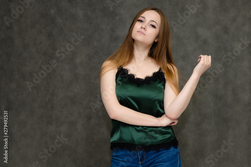 Concept portrait below belt of pretty girl, young woman with long beautiful brown hair and green t-shirt and blue jeans on gray background. In the studio in different poses showing emotions.