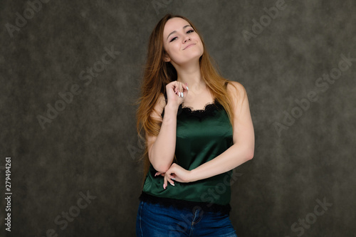 Concept portrait below belt of pretty girl, young woman with long beautiful brown hair and green t-shirt and blue jeans on gray background. In the studio in different poses showing emotions.