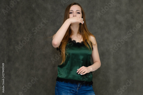 Concept portrait below belt of pretty girl, young woman with long beautiful brown hair and green t-shirt and blue jeans on gray background. In the studio in different poses showing emotions.
