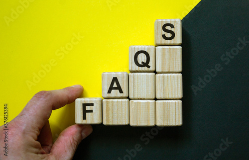 Concept word 'FAQS' on cubes on a beautiful blue and yellow background. Male hand. Business concept.