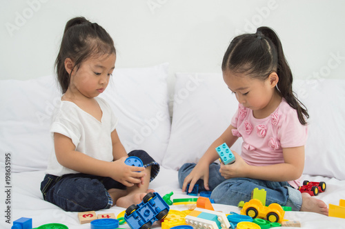 Concepts of learning skills. Little Children are learning skills to play with toys. Little Children are playing in the playroom. Asian Little Children playing with friends in the bedroom