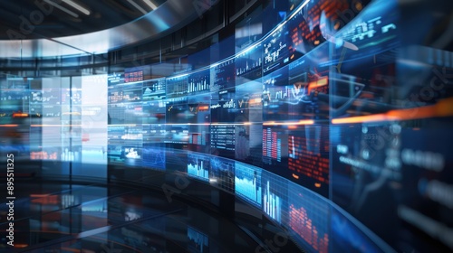 conceptual digital display of global financial news streaming in real-time on a curved, transparent screen in a futuristic setting