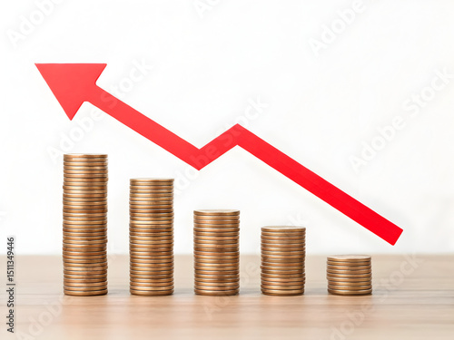 conceptual finance icon red arrow down with coin towers decreasing budget cuts isolated with no background 73866092 1