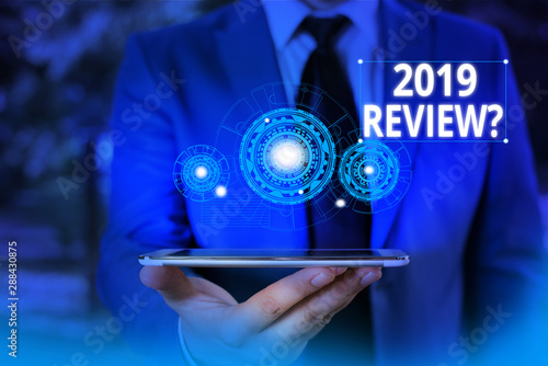 Conceptual hand writing showing 2019 Review Question. Concept meaning remembering past year events main actions or good shows Male wear formal suit presenting presentation smart device