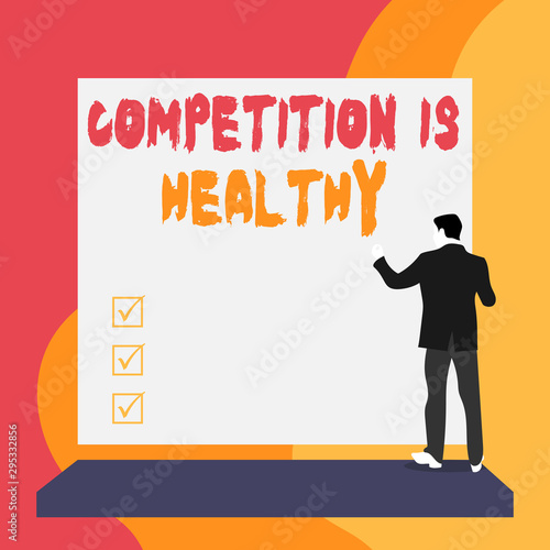 Conceptual hand writing showing Competition Is Healthy. Concept meaning Rivalry is good in any Venture leads to Improvement Back view young woman watching blank big rectangle
