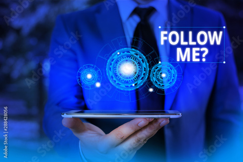 Conceptual hand writing showing Follow Me Question. Concept meaning go or come after demonstrating or thing proceeding ahead Male wear formal suit presenting presentation smart device