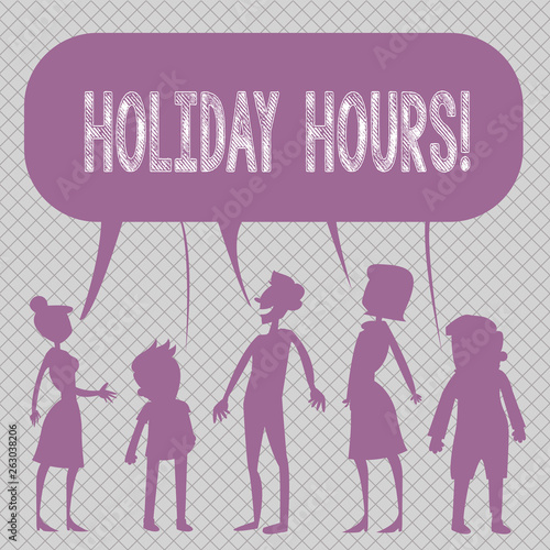 Conceptual hand writing showing Holiday Hours. Concept meaning Overtime work on for employees under flexible work schedules Figure of People Talking and Sharing Colorful Speech Bubble