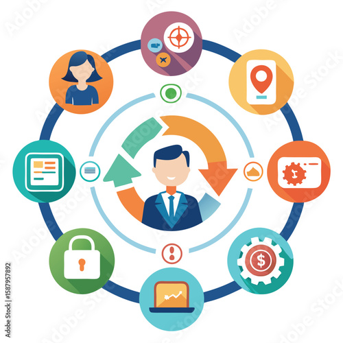 Conceptual illustration depicting a business manager surrounded by elements indicating goals, strategies, and success within circular process charts (cycle diagrams)