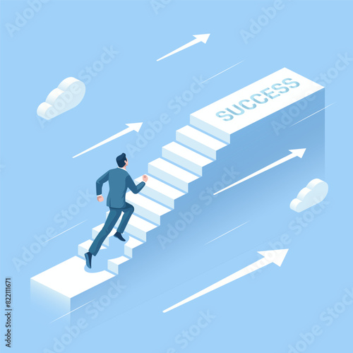 Conceptual illustration of a person climbing stairway towards the sky, symbolizing career growth and aspirations, with upward arrows for motivation. Isometric vector illustration