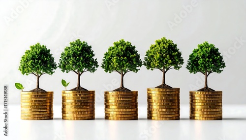 Conceptual image depicting financial growth. Five young trees sprout from stacks of gold coins, symbolizing investment & wealth