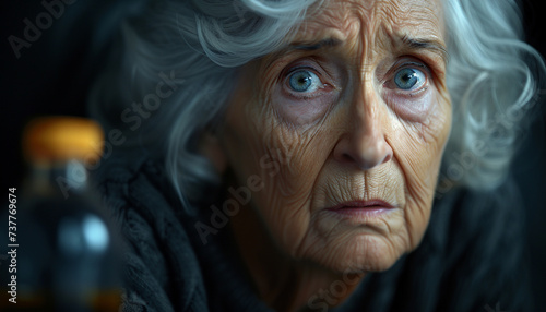 Concerned senior woman with deep blue eyes and wrinkled skin showing emotion.