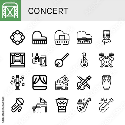 concert, icon, set, vector, stage, tambourine, grand, piano, microphone, spotlight, banjo, guitar, drum, bass, ticket, fiddle, conga, karaoke, bongo, saxophone, illustration, symbol, isolated, design, music, signs, entertainment, art, musical, sound, outline, audio, black, instrument, acoustic, equipment, element, classic, white, silhouette