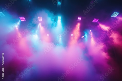 Concert stage lights, pink blue haze, indoor venue, event background.