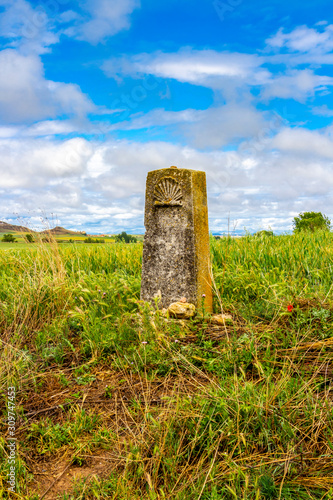 adventure, beautiful, bollard, christian, cloud, concrete, culture, dirt road, emblem, europa, european, footpath, grass, hiking, indicating, journey, landscape, marker, marking, mediaeval, nature, no people, old, picturesque, pilgrim, pilgrimage, post, religion, route, scene, scenic, shell, signs, sky, spain, spanish, springtime, stone, symbol, tradition, vegetation