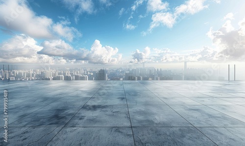Concrete floor or slab, empty space or area in showroom, shop or store. Background design with blue sky and urban city for product display and concept of car sale, auto, automobile, automotive.