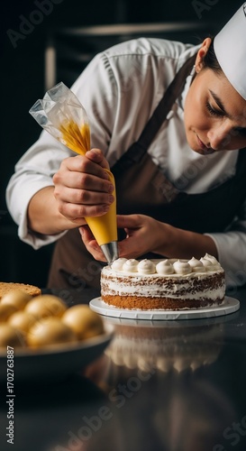 confectioner, cake, frosting, dessert, baking, chef, decorating, sponge cake, pastry, food, bakery, cream, cooking, baker, cookery, sweet, homemade, delicious, confectionery, culinary, icing, food preparation, professional, skill, occupation, uniform, hat, culinary arts, kitchen, eatery, expertise, precision, sweet food, food industry, small business, artisan, craft, epicure, pastry shop