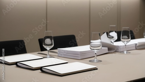 table, conference, meeting, room, document, paper, file, report, goggles, wine, champaign, empty, blank, notebook, pad, stationery, office, business, corporate, professional, elegant, minimalist, modern, clean, simple, neutral, beige, colours, design, interior, setting, preparation, ready, organised, arrangement, background, image, still, life, presentation