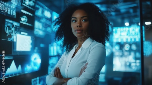 confident african american businesswoman in a hightech office space surrounded by floating holographic screens displaying data analytics and aidriven insights