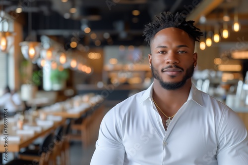 Confident African American with trimmed beard, white shirt, exudes quiet strength, poise as daylight filters through modern cafe. Composed restaurateur in crisp attire, reflects casual elegance