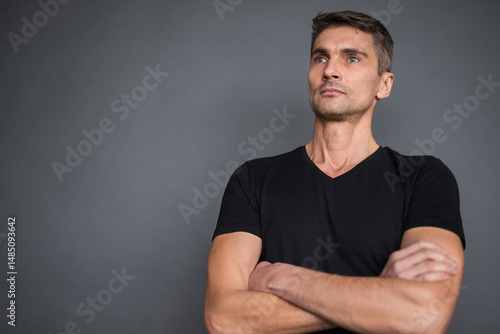 Confident and determined man in casual attire, arms crossed while looking upward against a gray background, symbolizing leadership and inner strength.