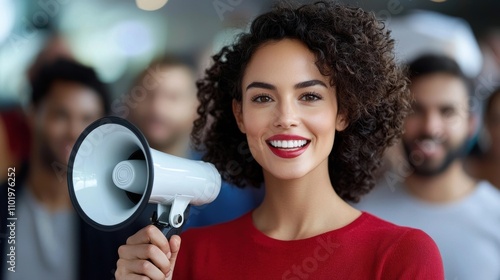 woman, female, person, megaphone, speech, communication, announcement, protest, rally, activist, political, social, advocacy, campaign, microphone, speaker, leader, authority, confident, strong, bold, smiling, happy, cheerful, energetic, enthusiastic, crowd, audience, event, gathering, people, urban, city, street, marketing, advertisement, business, corporate, leadership, empowerment, community, revolution, change, engagement, passion, determination, influence, voice