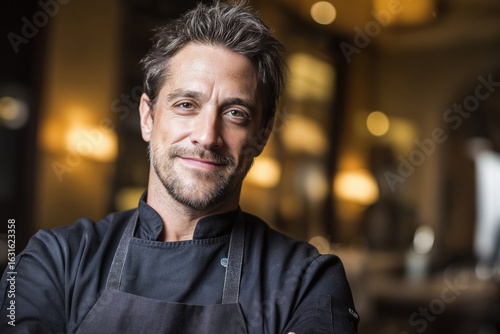 Confident and talented chef smiles warmly in his restaurant ready to welcome hungry guests tonight