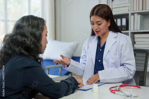Confident Asian female doctor explains and questions a retired female patient attending a private clinic for treatment and therapy. Health concept, health insurance.