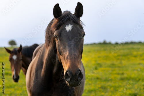 horse, star, closeup, portrait, gaze, stare, eye, equine, pet, animal, confident, foreground, background, pasture, meadow, nature, rural, countryside, calm, powerful, alert, wildlife, presence, individuality, leadership, strength, identity, mammal, fur, serenity, emotional, expressive, connection, farm, domestic, spring, grass, wallpaper, copy space