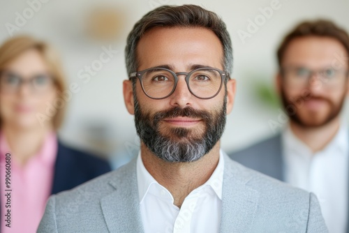 Confident business leader standing in front of colleagues, representing leadership, teamwork, and professionalism in the workplace.