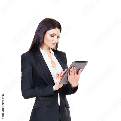 tablet, woman, executive, business, businesswoman, white, young, director, isolated, black, suit, secretary, attractive, pad, copy, blank, success, cyberspace, copy space, occupation, casual attire, people, men at work, female, technology, smiling, computer, monitor, girl, businessperson, face, touch screen, person, education, cheerful, boss, beautiful, background, successful, space, device, job, office, confident, brunette, screen, happy, career, concept