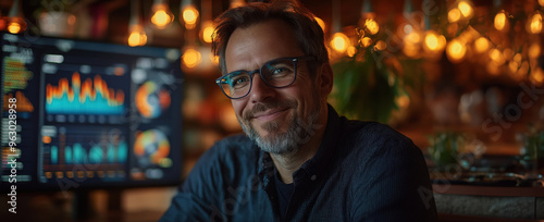 businessman, man, smile, confident, happy, professional, success, business, work, office, technology, laptop, computer, screen, desk, chair, light, goggles, beard, chart, graph, datum, financial, entrepreneur, startup, workplace, corporate, modern, urban, city, building, interior, adult, mature